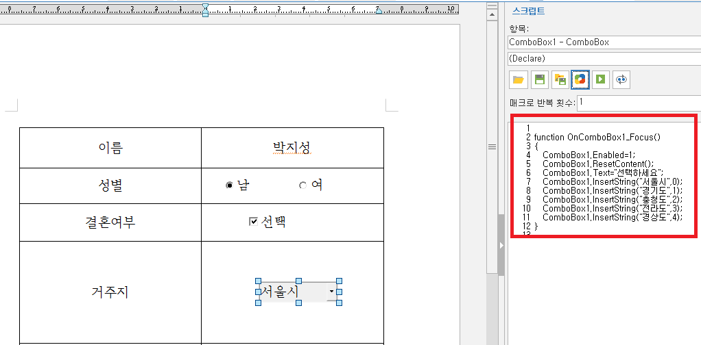 이번 시간에는 한글의 양식개체(체크버튼, 라디오버튼, 콤보박스)의 정보를 엑셀로 옮기는 작업을 해보려 합니다.