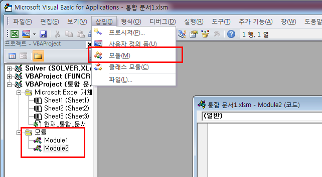 여기서 메뉴 => 삽입 => 모듈을 클릭하시면 왼쪽에 모듈에 Module이 생성됩니다